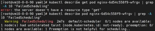 # 根据上述日志直接指出:1个节点有不可容忍的污染{node.kubernetes。id:没有准备好}。preemption: 0/1节点可用:1抢占对调度没有帮助,接下来针对性排查。
