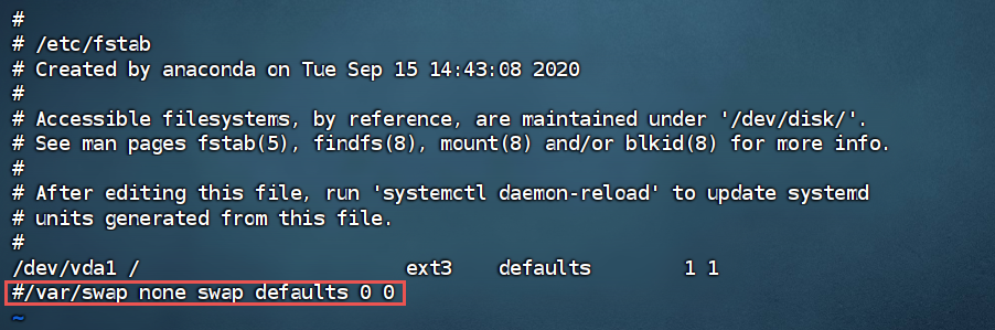 编辑 /etc/fstab,注释掉 swap 相关的行: