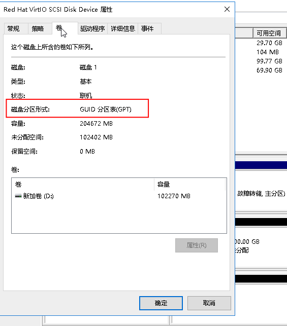4.在弹出的对话框中,单击卷页签,查看磁盘分区形式。