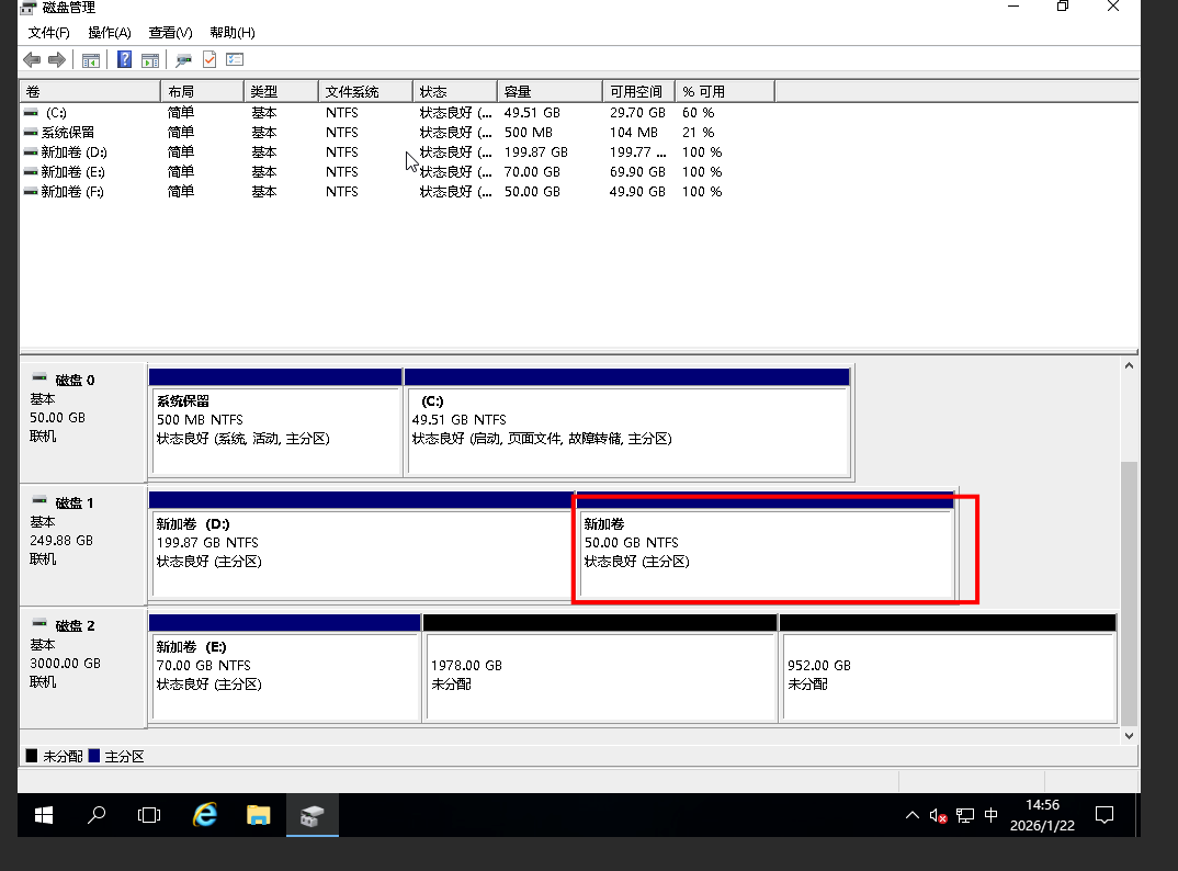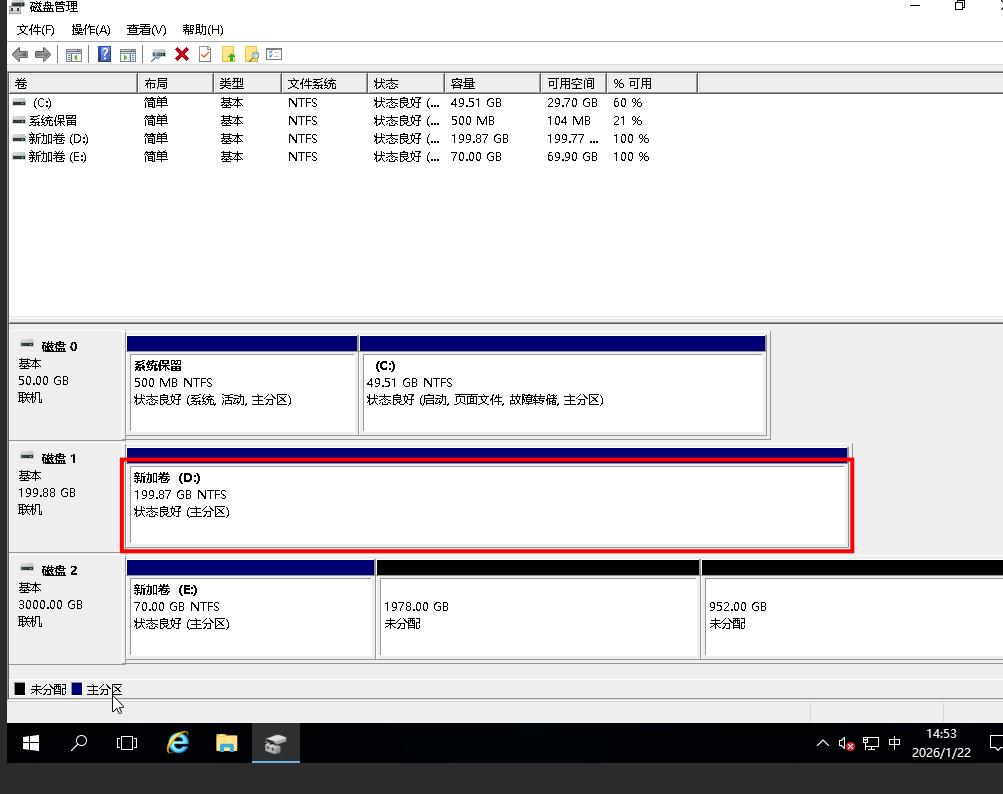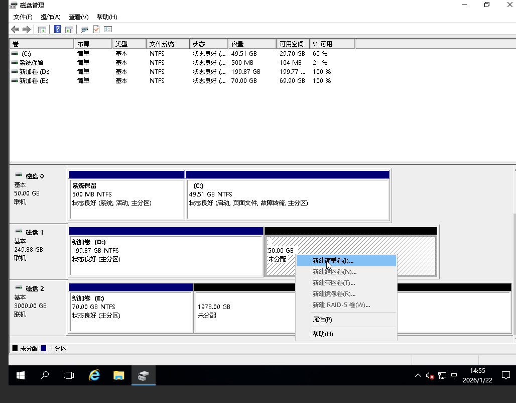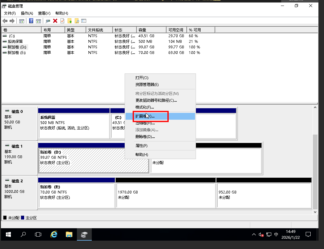 在Windows Server桌面,右键单击图标,选择磁盘管理。