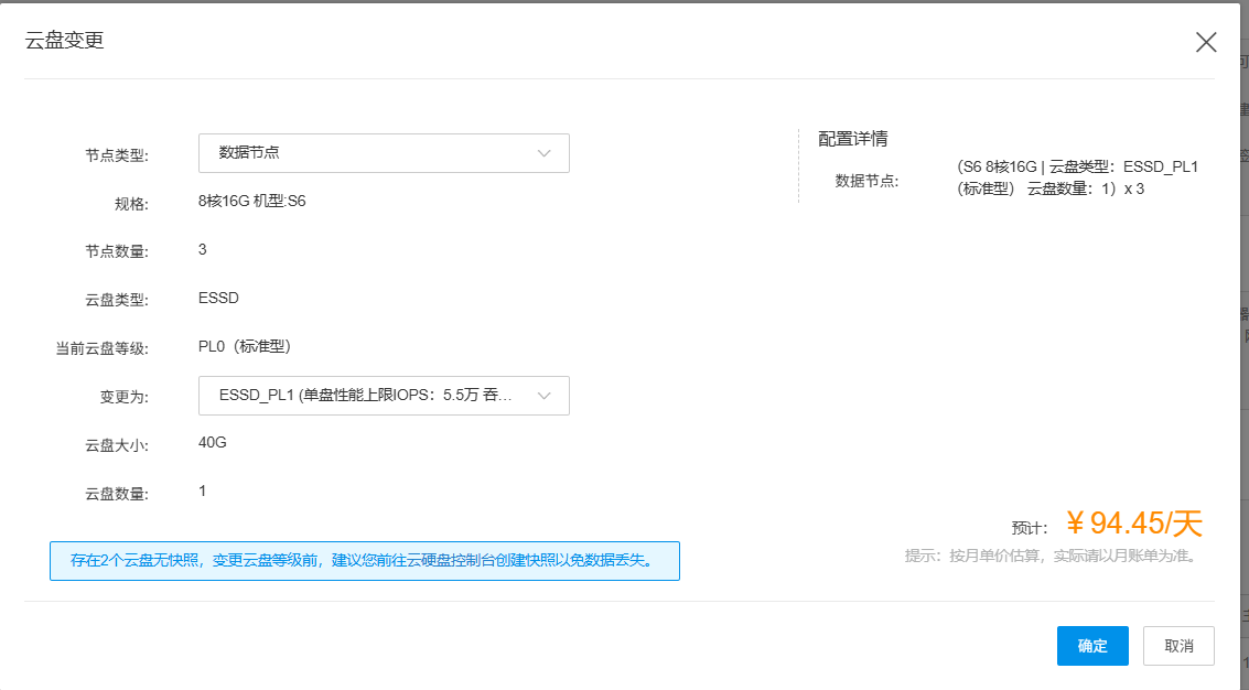 云盘容量:仅变更云盘性能等级,不改变云盘容量。如需调整容量,需通过集群升配功能操作