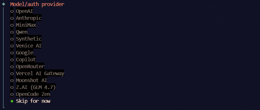 5、在Model/auth provider中选择Skip for now,后续进行配置。
