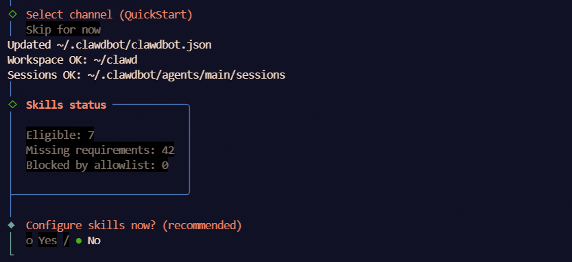 Configure skills now? (recommended) | 是否立即配置agent技能,包括自定义指令、工具链等。 | 选择 “No”,后续进行配置。 |