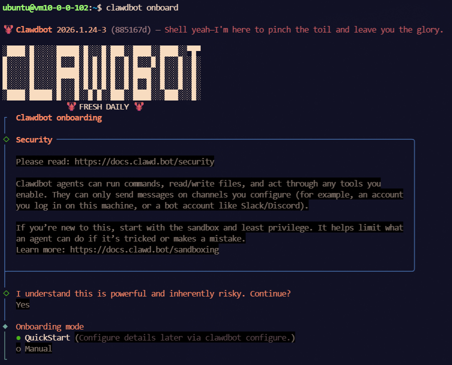 I understand this is powerful and inherently risky. Continue? | Moltbot提醒用户该功能有高权限风险,确认操作后才允许继续 onboarding。 | 勾选 “Yes” ,确保明确风险。 |