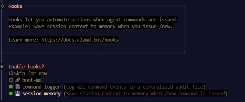 Enable hooks? | 是否启用内部hooks,如command-logger、session-memory等功能。 | 按空格键选中选项,按回车键进入下一步。建议选中: