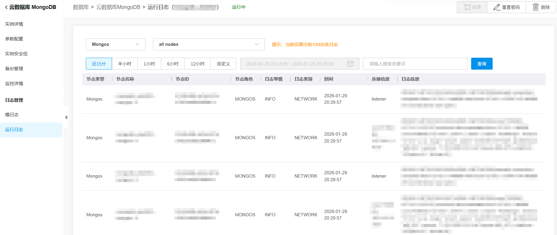 1. 可以查看7日内副本集实例和分片集群实例的所有节点的运行日志信息;