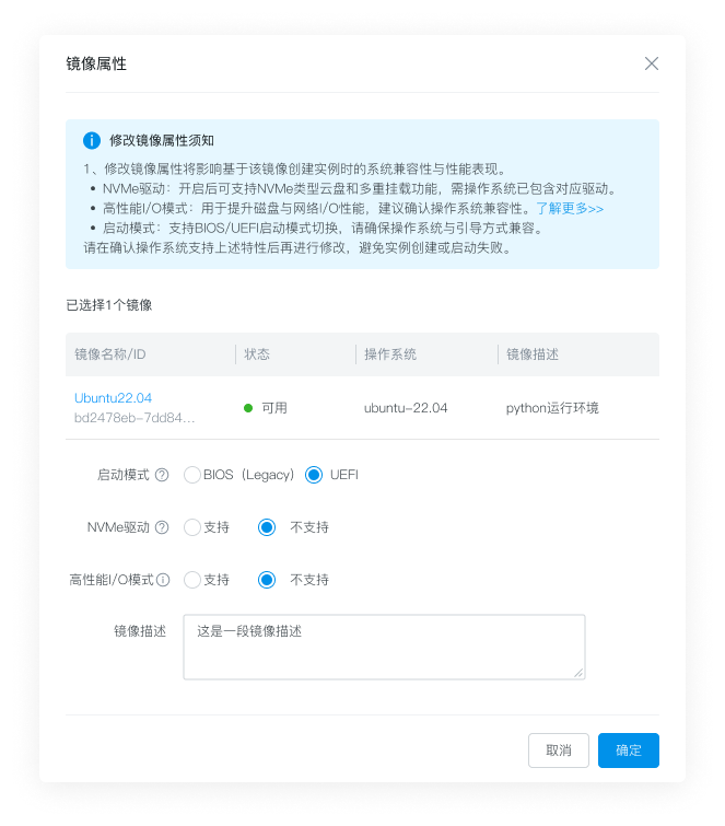 若自定义镜像符合以上要求,可以在控制台修改镜像属性“高性能I/O模型”为支持。