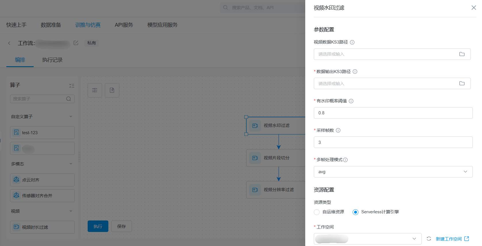 点击确认后,工作流创建成功,跳转进任务编排页,可选择任务/服务或者预置算子、自定义算子进行编排