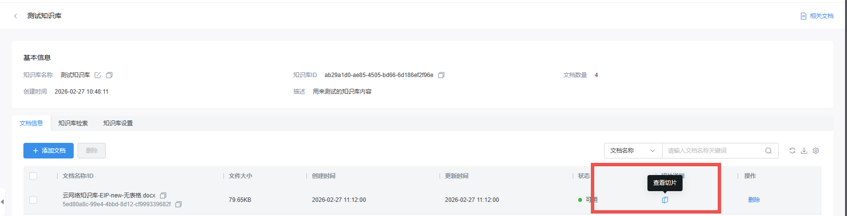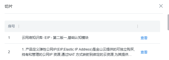 针对需要深入核验的切片,点击其右侧的「查看」按钮,系统将弹出切片详情弹窗。弹窗内会清晰展示切片的归属文档名称、切片核心内容及字符数等关键信息,帮助用户精准确认切片的内容完整性与分段合理性。