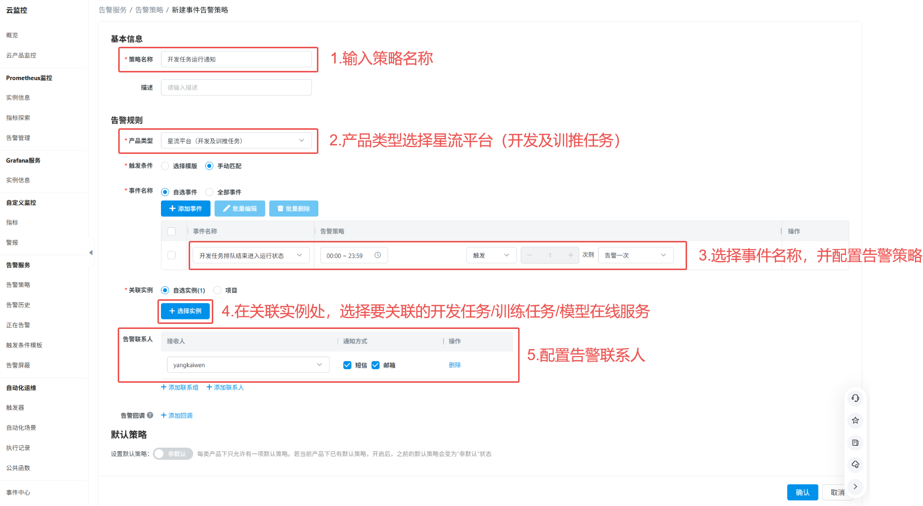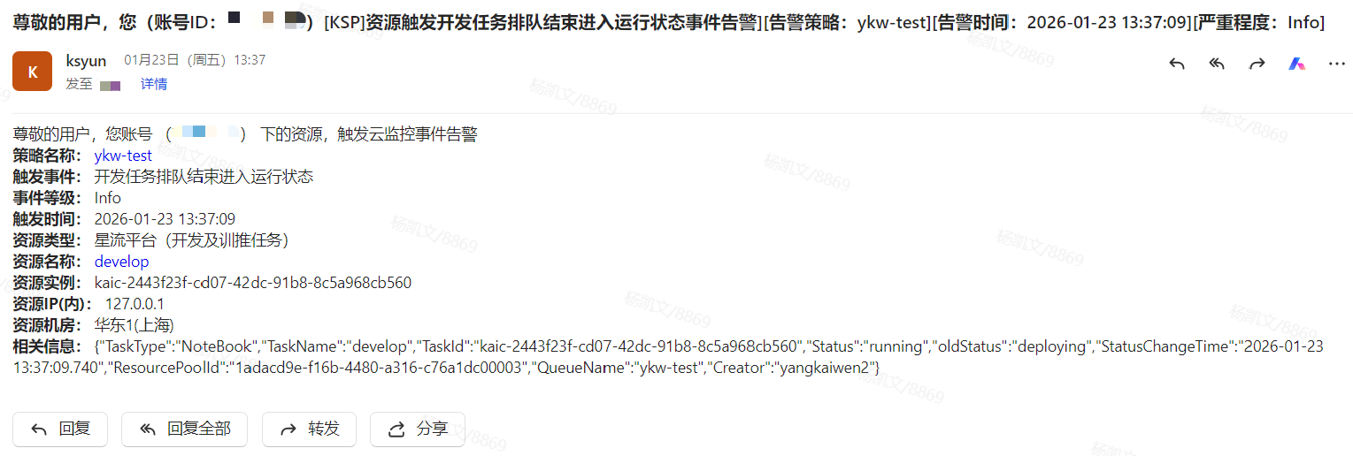 本功能支持当开发、训练任务和模型在线服务的状态变化时,通过云监控主动推送告警通知,支持短信、邮件形式。以便用户实时感知任务状态变更,及时处理异常。