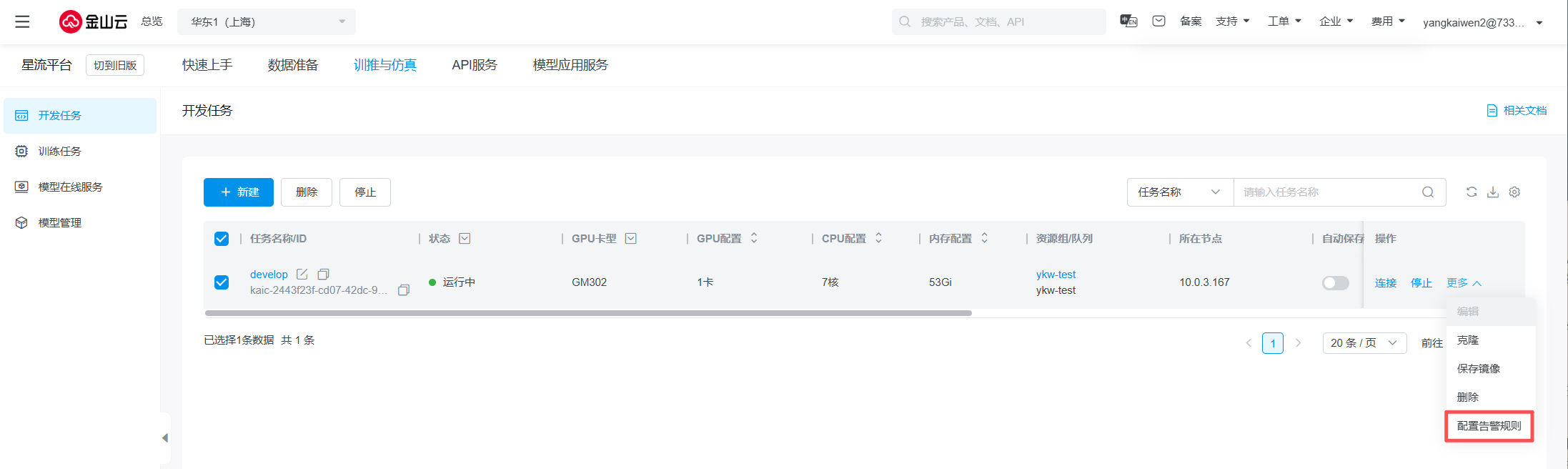 开发任务状态异常 | 创建中 -> 异常 排队中 -> 异常 启动中 -> 异常 运行中 -> 异常 停止中 -> 异常 镜像保存中 -> 异常 | Warn | |