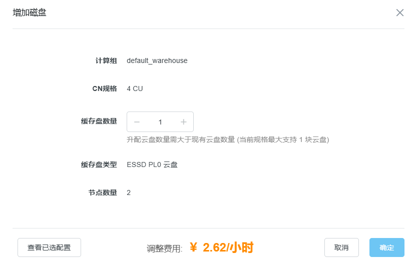 在目标计算组详情页面,单击缓存盘数量右侧的增加磁盘。