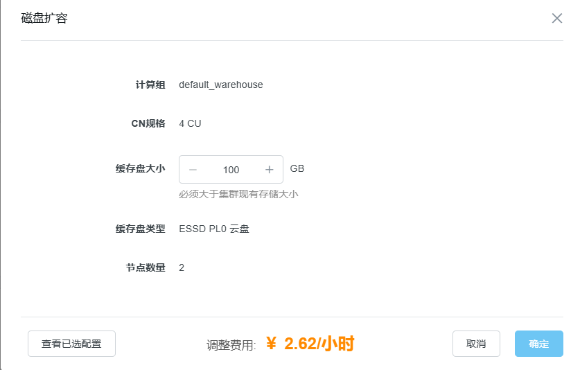 在计算组磁盘扩容面板中,可以修改缓存盘大小,勾选服务协议,单击确定。