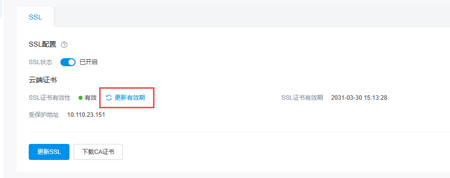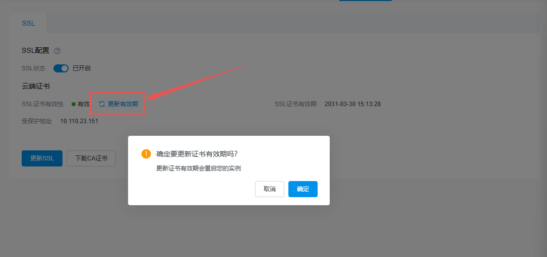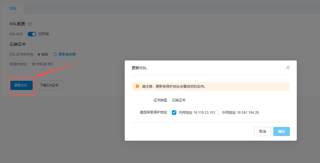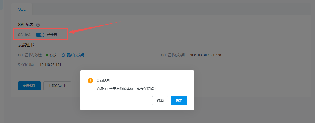 开启 SSL 加密、关闭 SSL 加密、更新证书、更新受保护地址会重启实例,建议在业务低峰期操作。