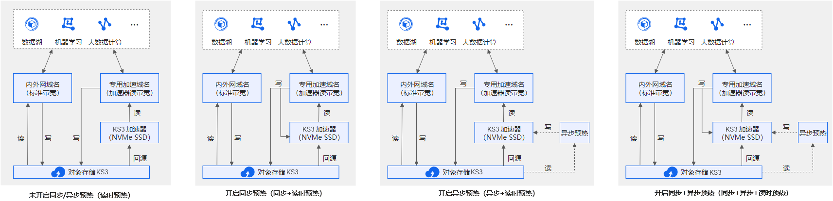 同步预热:开启同步预热功能后,客户端通过加速域名向加速器发送的写请求会同时写入KS3桶和加速器中。