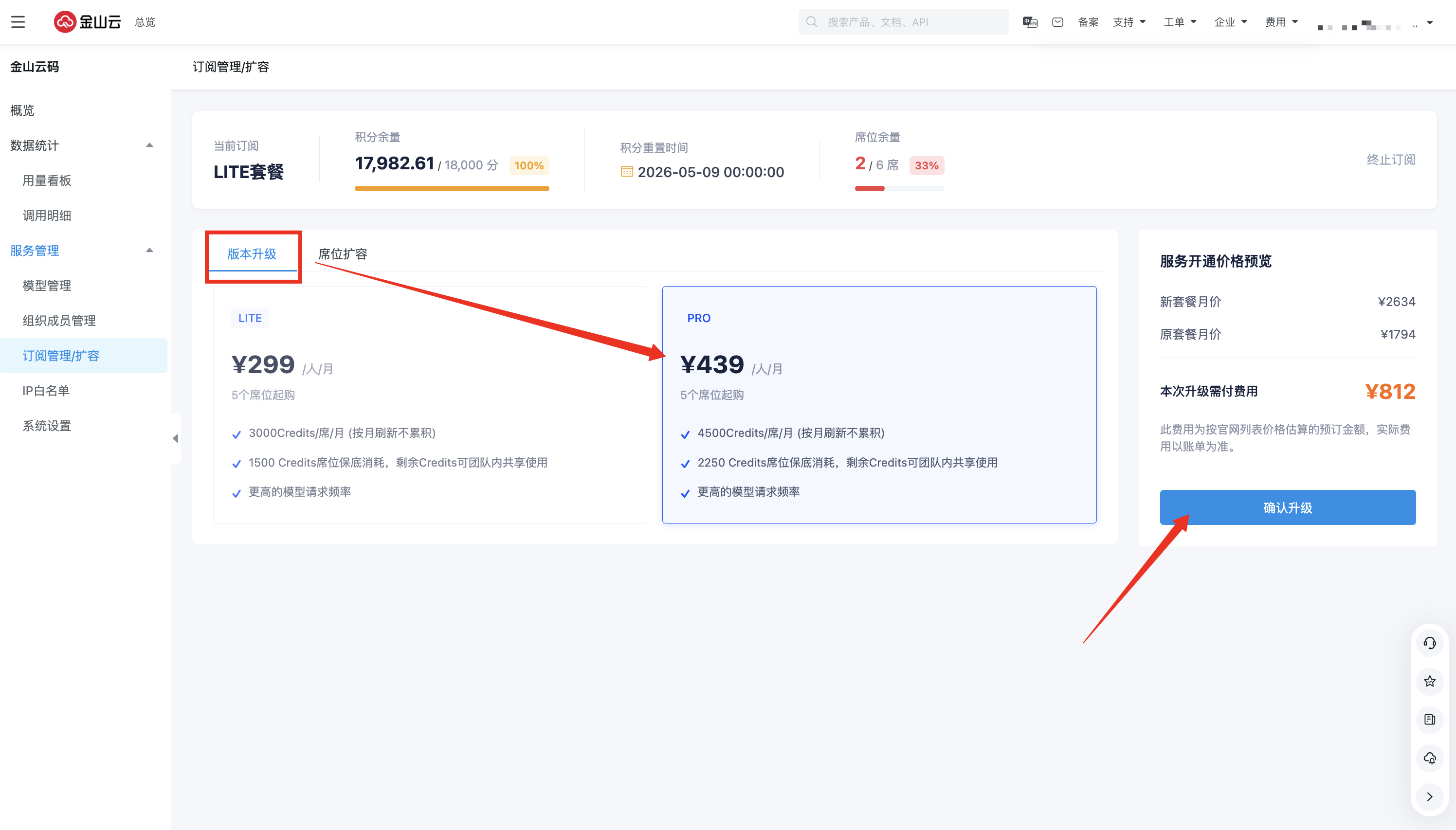 原先您购买的是LITE版,5个席位,每个席位3000积分,已经消耗了一些,在月中15号升级为PRO版,席位数不变,每个席位是4500积分: