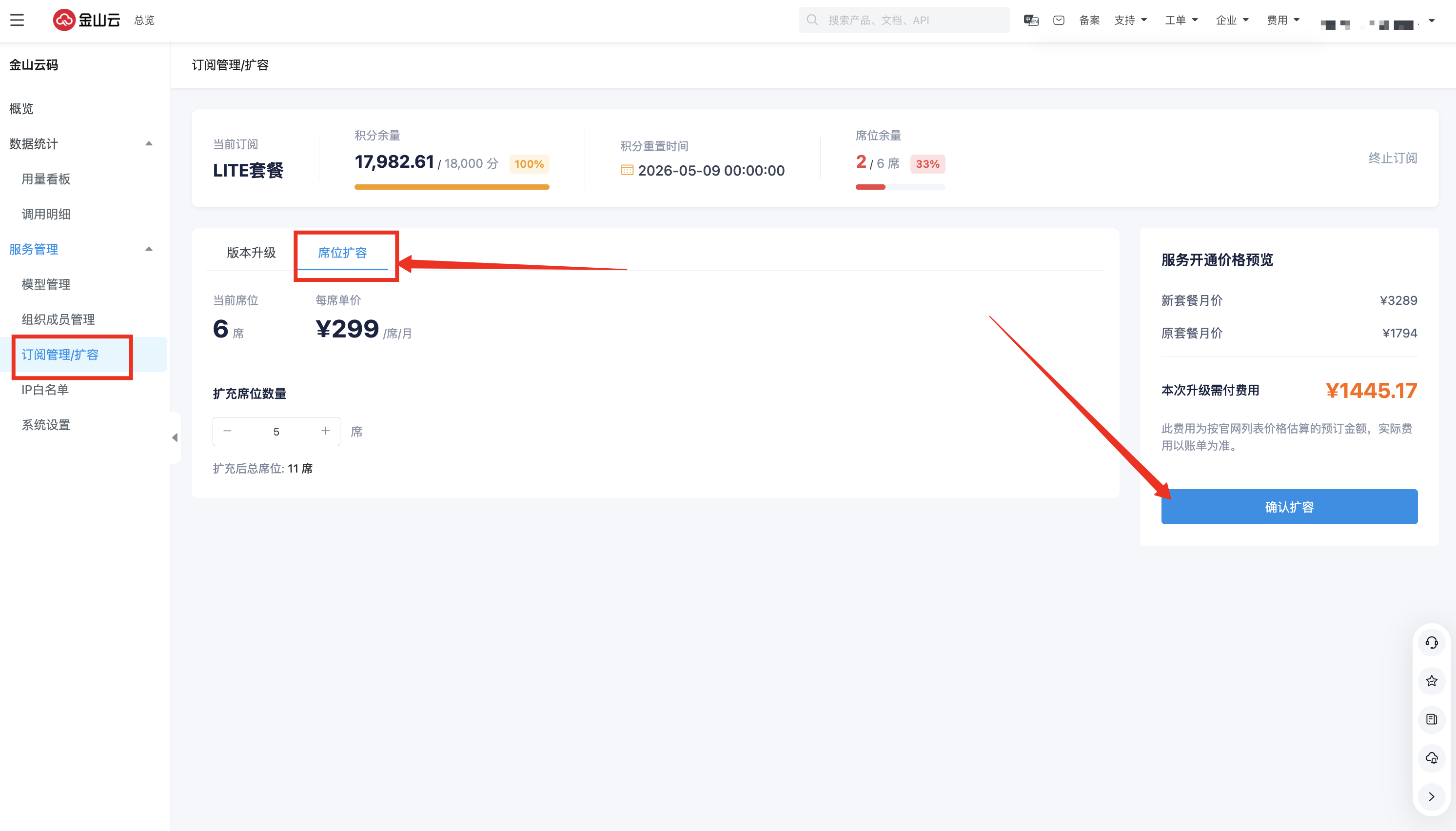 点击左侧菜单进入订阅管理/扩容页面,点击席位扩容后,再点击确认扩容按钮;