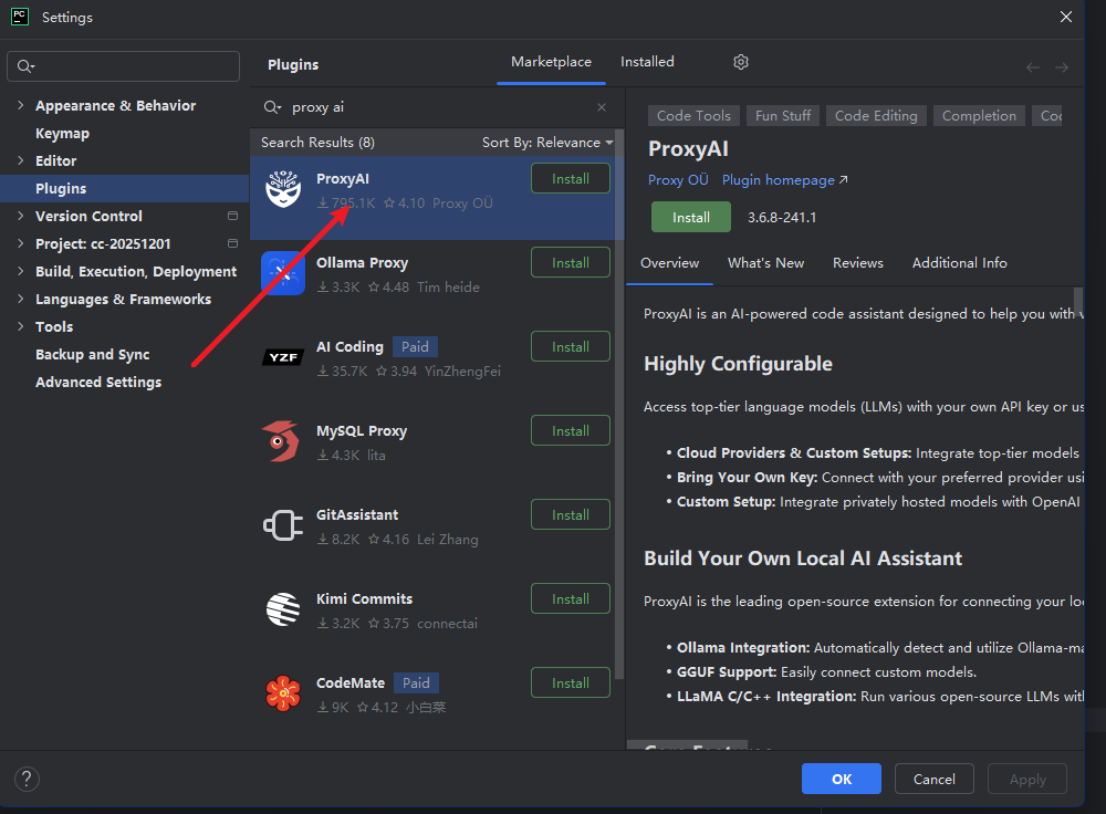 打开PyChom插件商店,搜索并安装 ProxyAI。