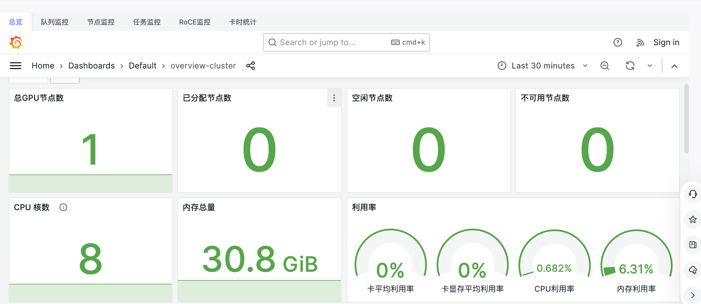 2. 选择资源监控页签,即可查看相应监控数据,包括总览数据、当前资源组上的队列监控节点监控任务监控RoCE监控以及卡时统计等。