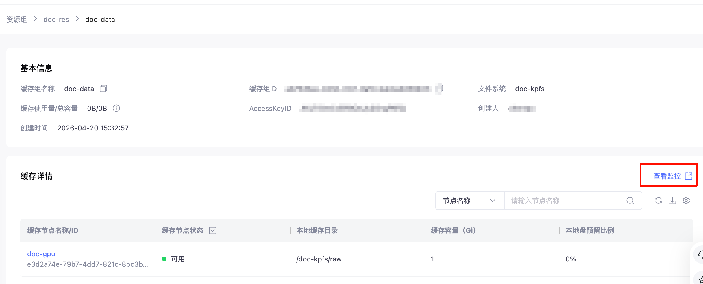 3. 在缓存详情区域,点击查看监控,即可进入文件存储系统的详细监控页面。
