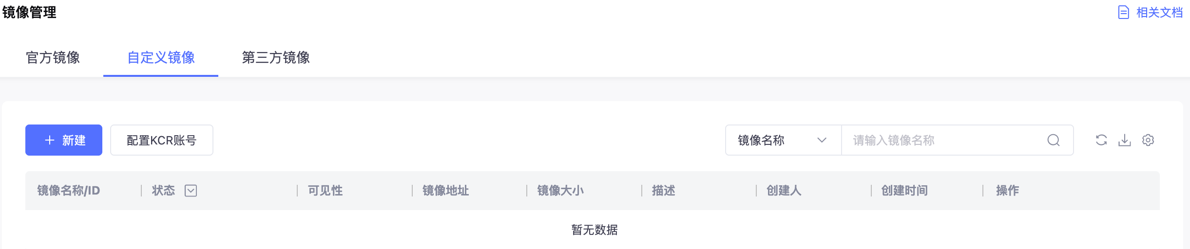 2. 选择自定义镜像页签,首次使用自定义镜像,需点击新建按钮旁的配置KCR账号,设置相应用户名和密码。