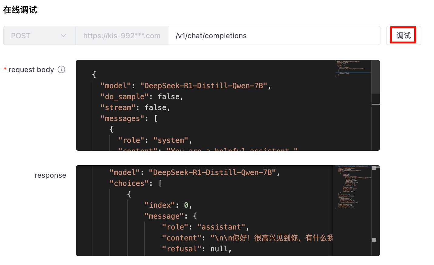 在request body内输入以下内容,并点击调试,即可查看相应response(响应)内容。