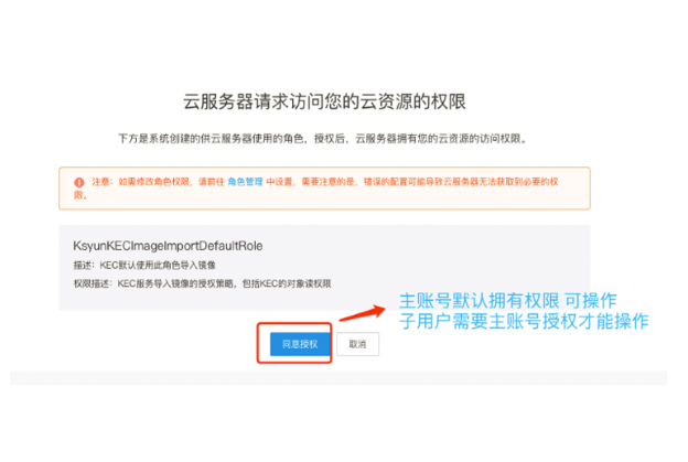 *注:子用户默认无权限操作服务授权,需要主账号给子用户授权,授权流程如下: