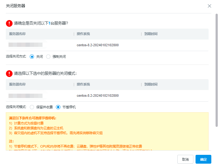 如果所选实例支持节省停机模式,则页面显示关闭模式选型。关于节省停机的详细介绍,请参考按量付费节省停机。