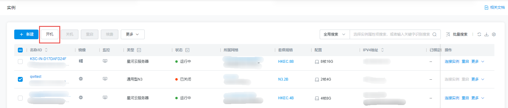 在实例列表中,选择一个或多个需要启动的实例,并单击开机。