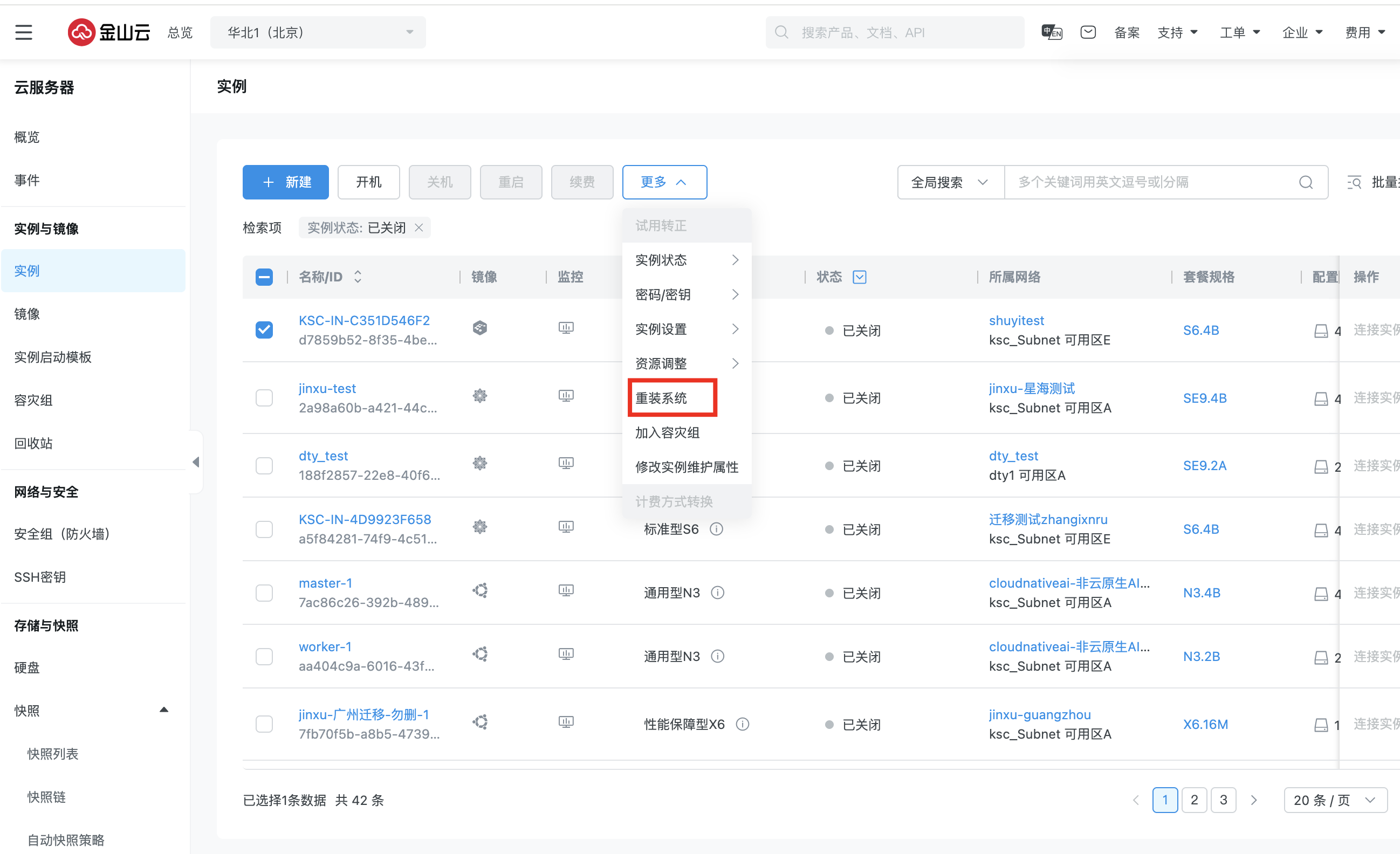 在实例列表中,选择一台需要重装系统且状态为“已关闭”的实例,并选择更多操作 > 重装系统。