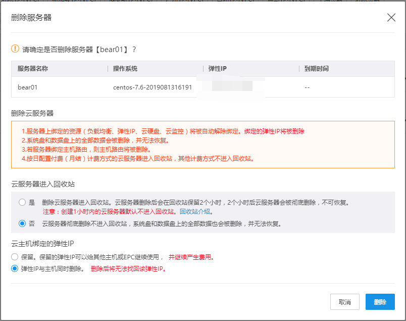 选中后,当主机到达定时删除时间时,绑定的弹性IP也将随主机一起删除(计费类型为包年包月的弹性IP只解绑,不删除)