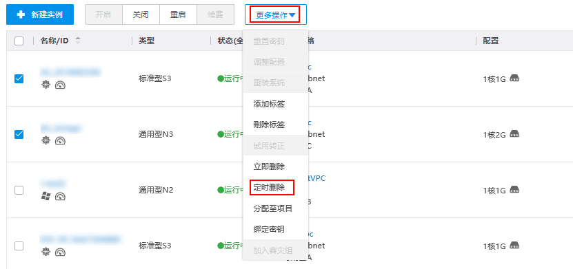 用户可以提前设定实例的删除时间,到达设定时间后,实例将自动删除,且不进入回收站。