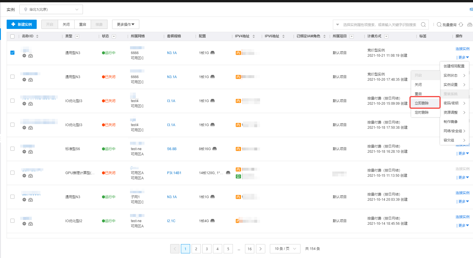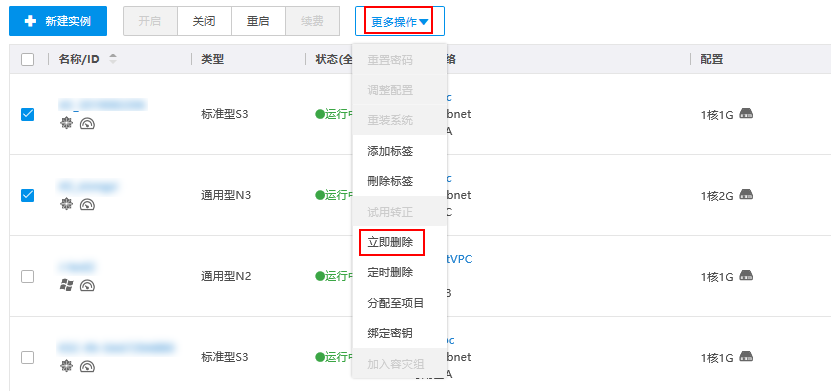 计费方式为“按量付费(按日月结)”实例和“按量付费”的实例支持“立即删除”功能。