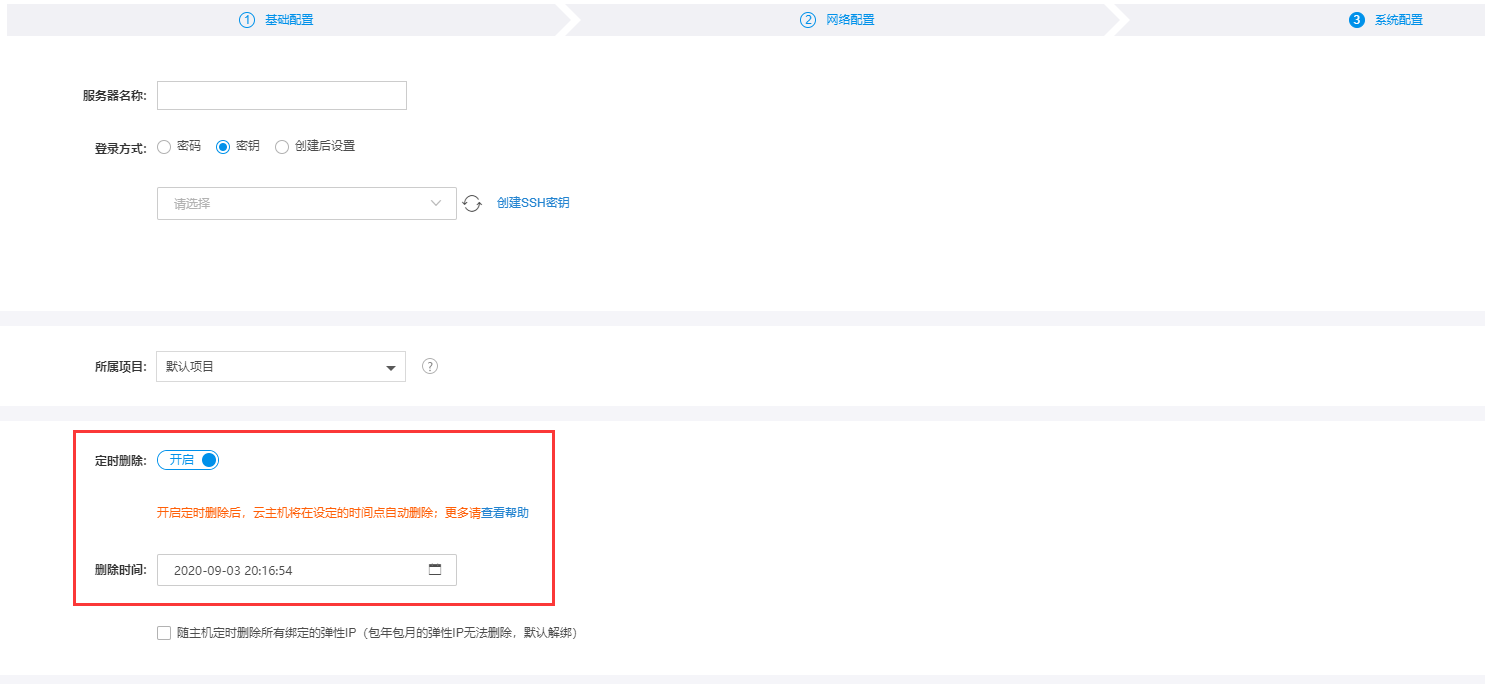 设置定时删除时,可选择是否随主机定时删除所有绑定的弹性IP。