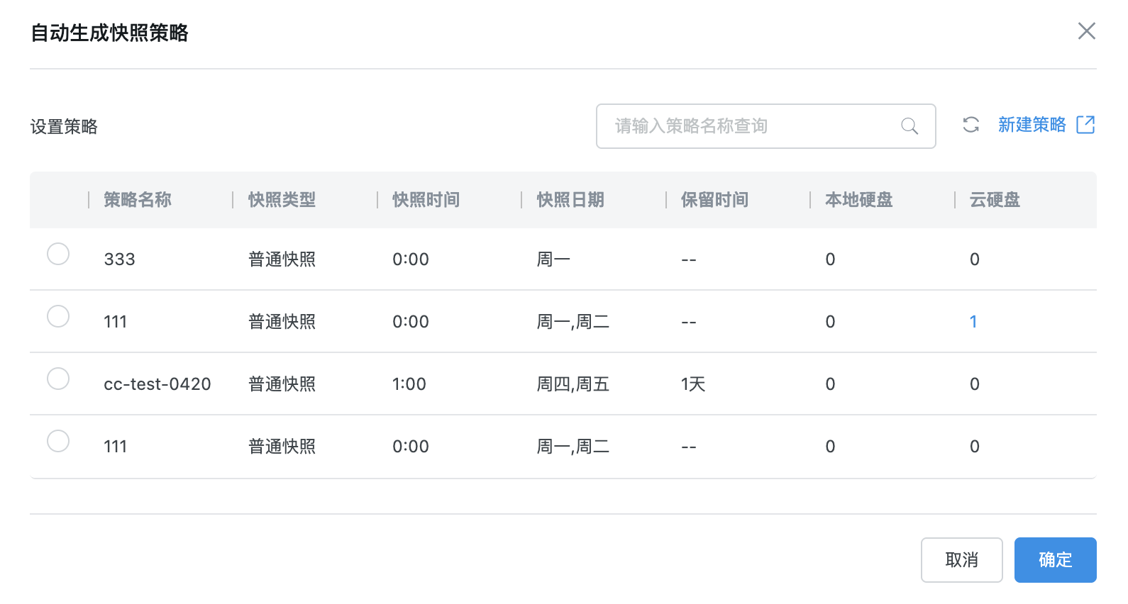 在设置自动快照策略页面,选择想要绑定的自动快照策略并单击确定。