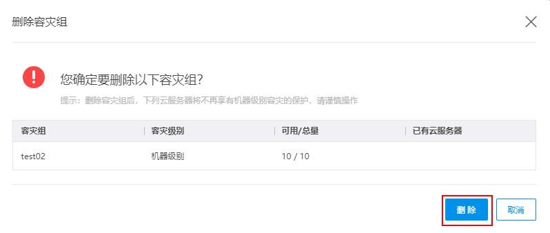 确认容灾组信息,并单击删除。