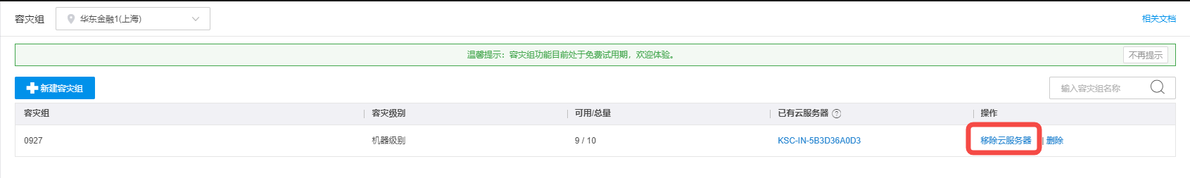 在目标容灾组对应的操作列,单击移除云服务器。