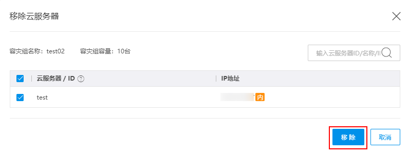 在移除云服务器页面中,选择想要移除的云服务器,并单击移除。