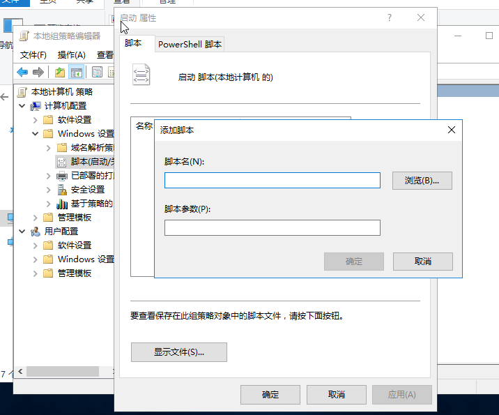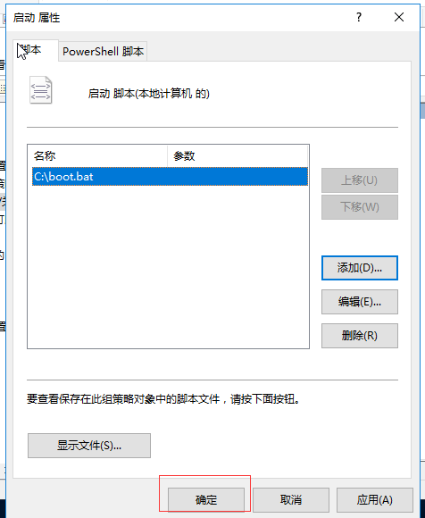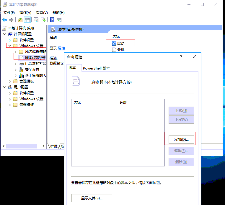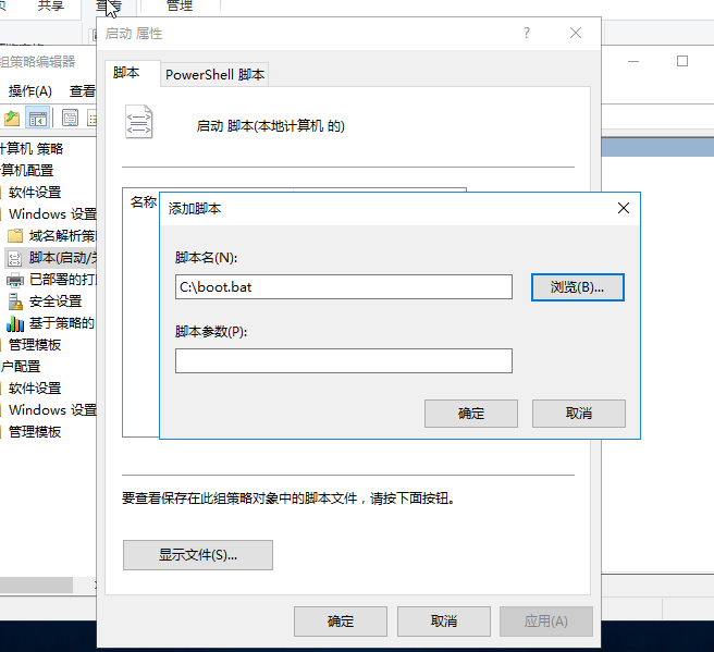 4.依次打开"计算机配置"–“Windows 设置”–“脚本”,选择"启动",点击"添加"。在弹出窗口中选择”浏览”,之后添加C:\boot.bat文件即可。