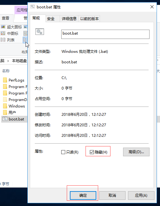 可将文件设置为隐藏文件,防止用户误删。右键点击新建的文件C:\boot.bat选择属性,将”隐藏”打勾即可隐藏文件。