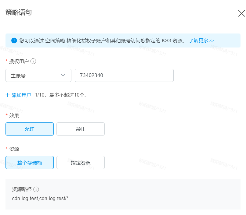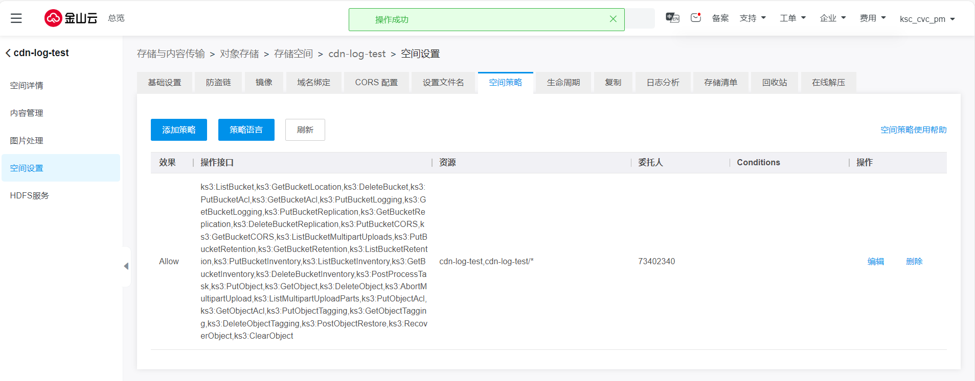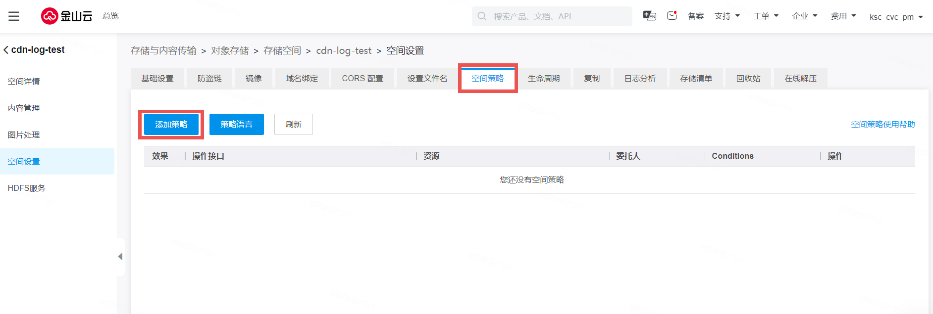登录ks3对象存储控制台,选择资源bucket,设置>空间设置>空间策略