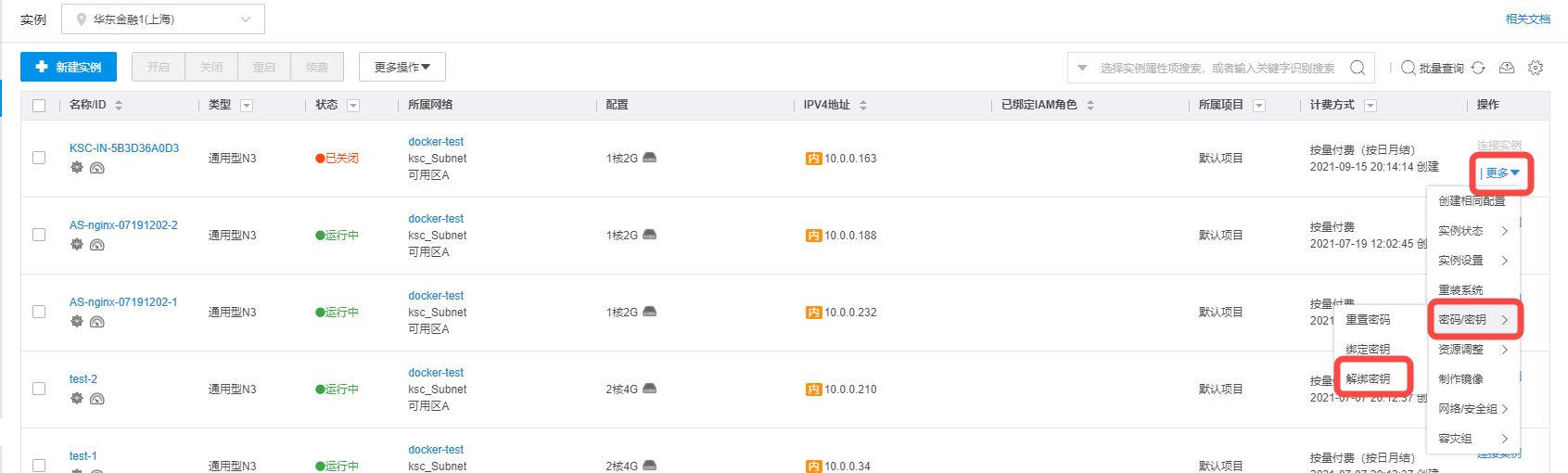选择想要解绑密钥的云服务器,并在对应操作列中,选择更多 > 密码/密钥 > 解绑密钥**。