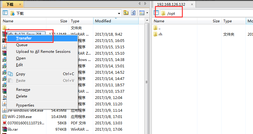 第三步:使用FTP工具,将本机上的JDK文档上传至Linux服务器下,此处上传到/opt目录下。