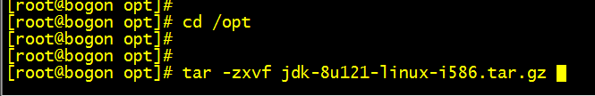 第四步:进入/opt目录,解压JDK的tar包,执行命令tar -zxvf jdk-8u121-linux-i586.tar.gz。在当前路径下面生成JDK的目录。