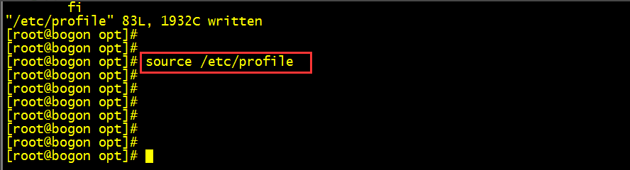 第六步:如果想让相关配置生效,需要执行/etc/profile。因此需要执行如下操作,source /etc/profile。