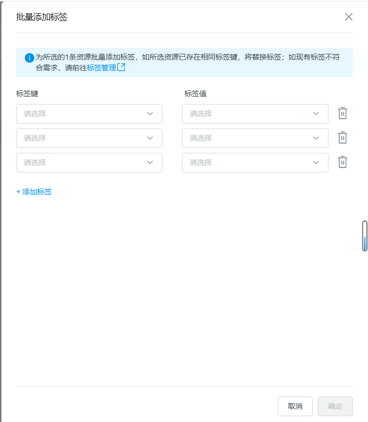 若您需要添加标签,在编辑标签值窗口,点击添加,选择标签键以及标签值,点击确定,即可添加成功。