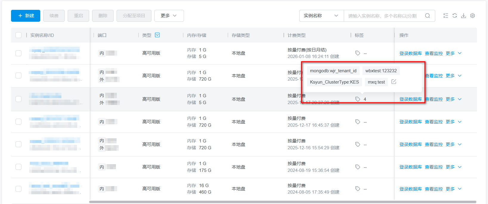 添加标签后,在实例列表标签列内会显示已添加的标签名称。