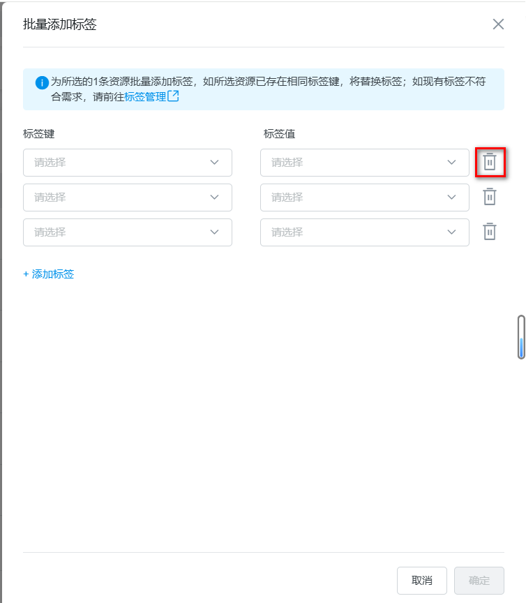 若您需要删除标签,在编辑标签值窗口,点击标签右侧的删除,点击确定,即可删除成功。