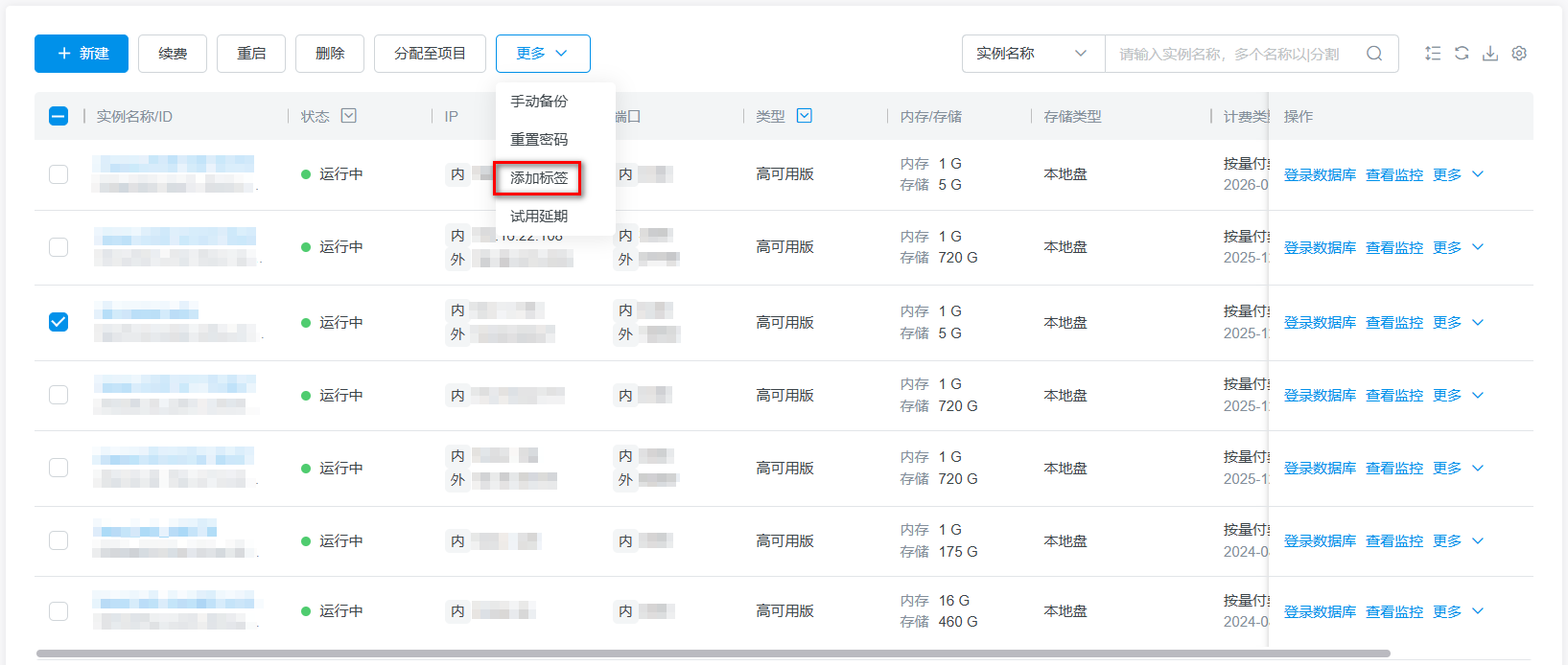 勾选需要添加标签的实例,点击实例操作按钮,选择菜单中的编辑标签。