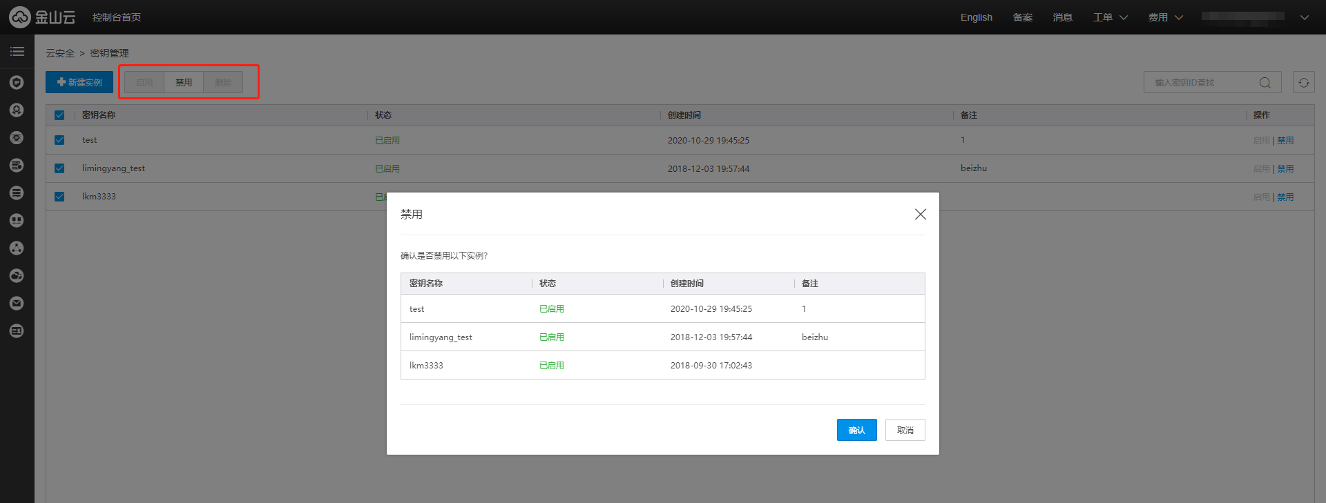 **注意:**如果同时选择了不同可用状态的密钥,则会在单击【启用】、【禁用】按钮后弹出的【操作确认框】中进行过滤,只展示可进行操作的密钥实例。